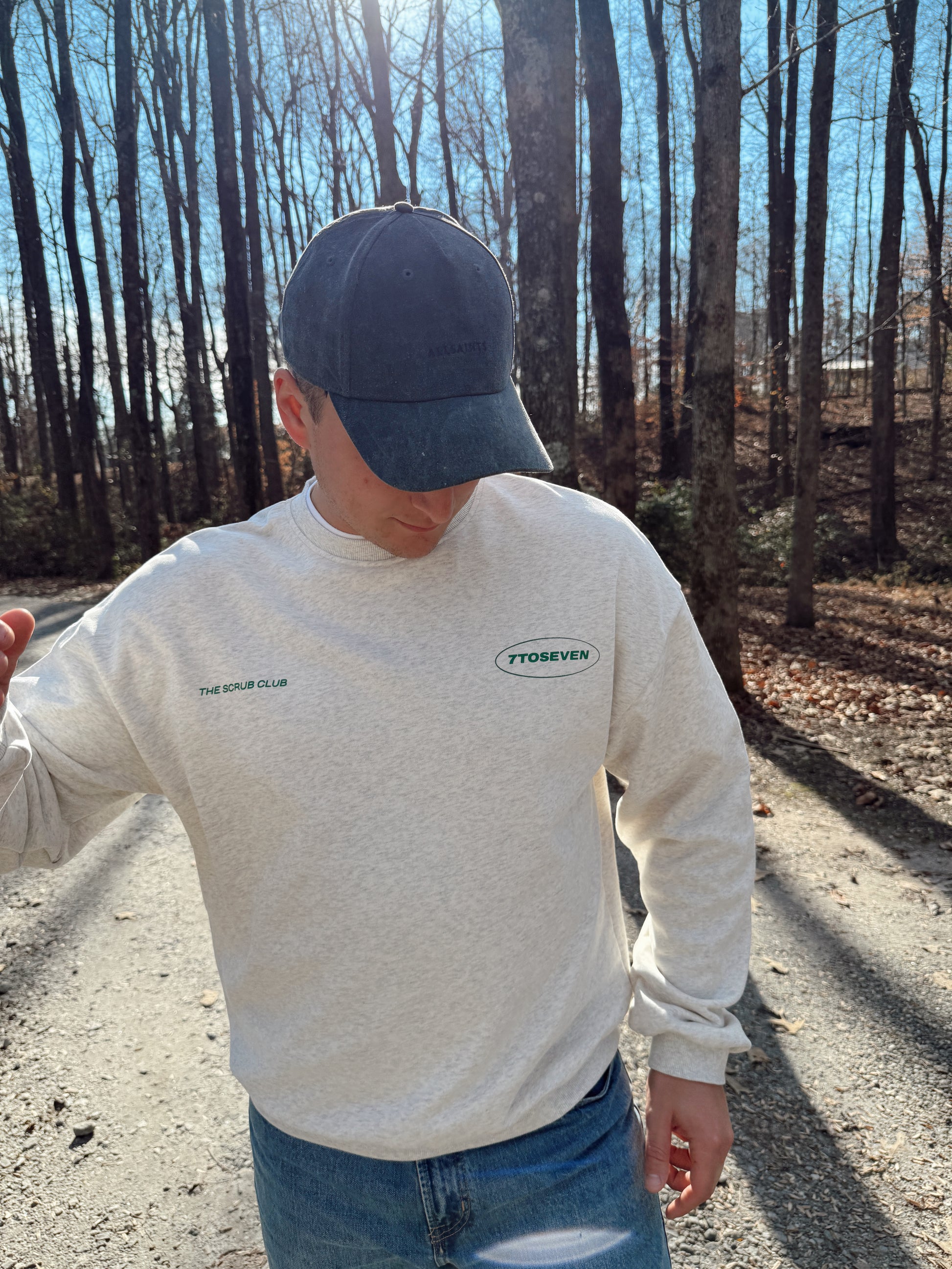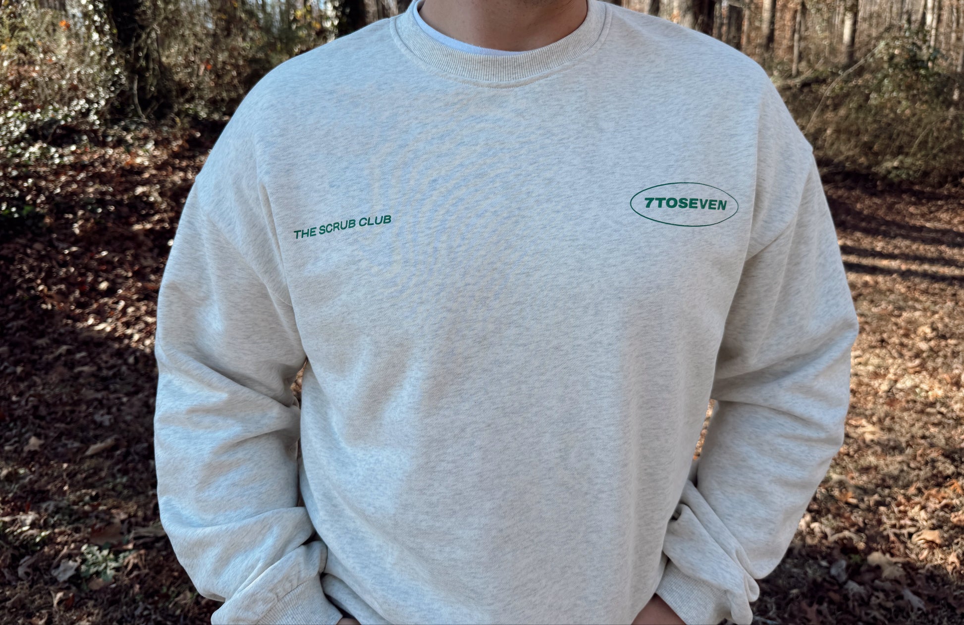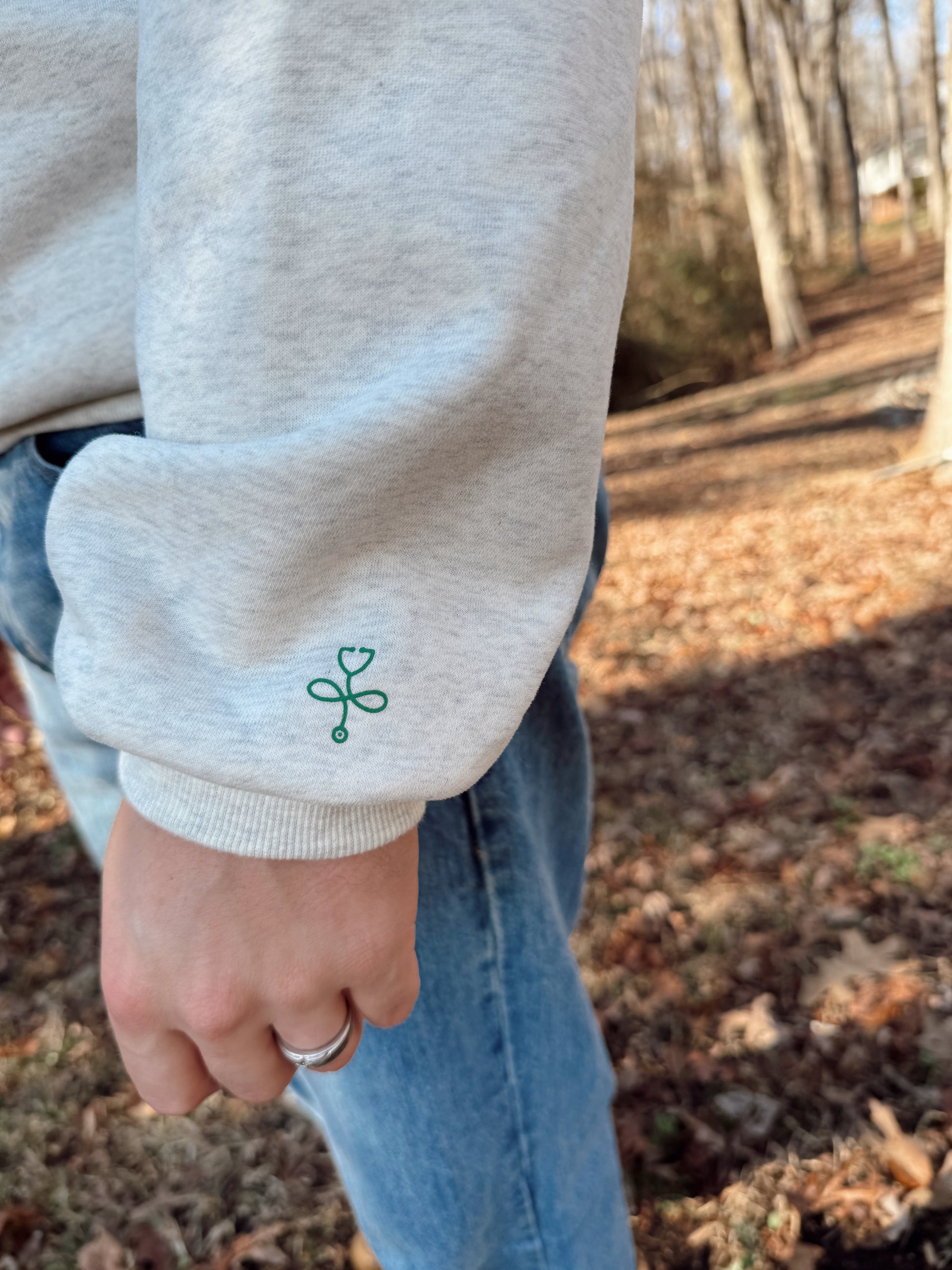 A gender-neutral crewneck in heather grey, created for healthcare workers who work the 7–7 shift. Designed with a relaxed fit and finished with screen-printed text, it’s made for everyday wear on or off shift.
