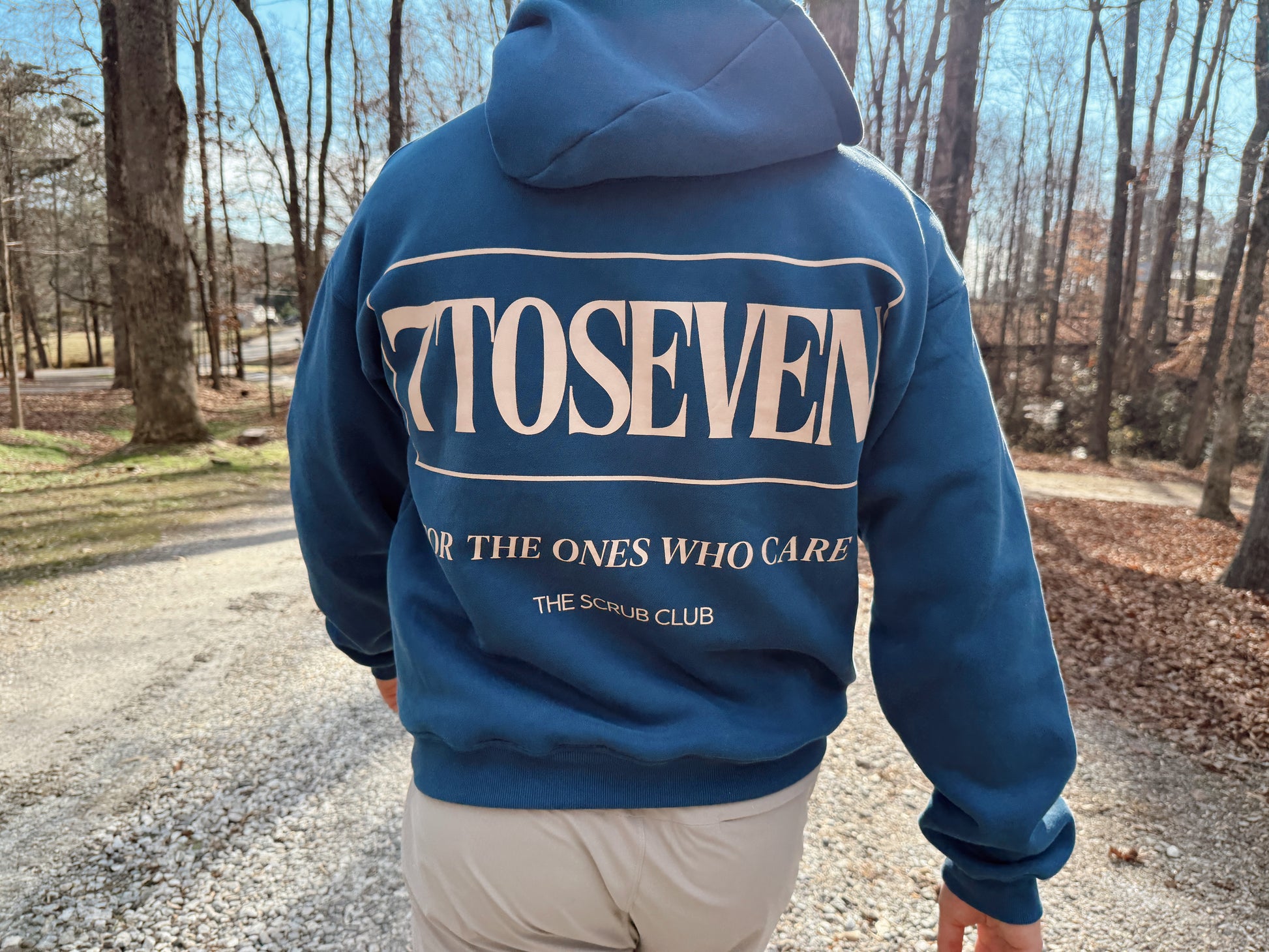 A gender-neutral hoodie in washed denim, created for healthcare workers who work the 7–7 shift. Designed with a relaxed fit and finished with screen-printed text, it’s made for everyday wear on or off shift.